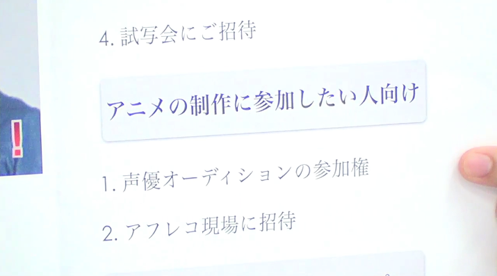 【対象】アニメを見たい人 + 制作に参加したい人【プレミアに見たい人向け】1.非公開の高画質版限定配信2.ノンクレジット版OP/ED動画配信3.公開予定のアニメにお名前掲載4.試写会にご招待【アニメの制作に参加したい人】1.声優オーディションの参加券2.アフレコ現場に招待【できたアニメとタイアップ】作中にて商品、ロゴの登場